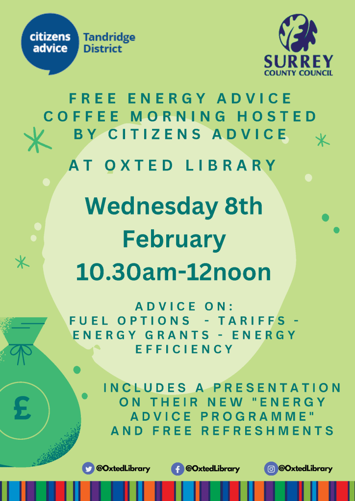 In conjunction with Tandridge Citizens Advice Bureau, Oxted Library will also be running a FREE energy advice coffee morning on 8th February 10.30am-12pm.