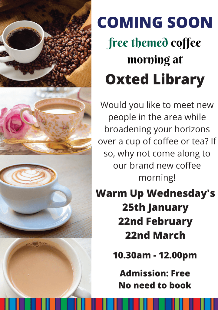 As part of the Surrey County Council’s Warm Welcome and Warm Hub Initiative, Oxted Library will be running FREE monthly Coffee Mornings in January, February and March, each with a different theme.