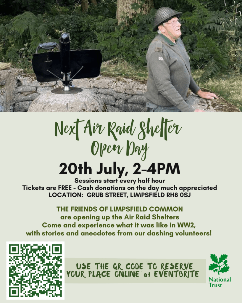 20 July – WW2 Air Raid Shelters Open Day – Grub Street, 2–4PM – Book online via www.friendsoflimpsfieldcommon.org