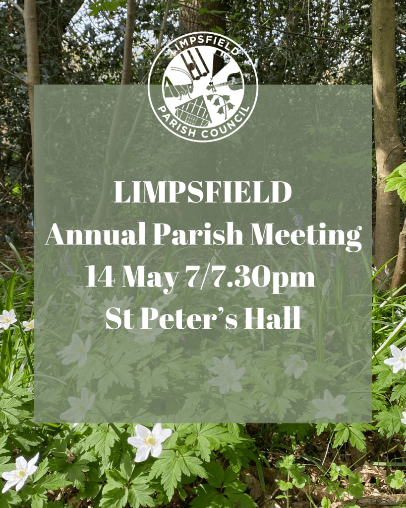 - Limpsfield Annual Parish Meeting – 14 May – St Peter’s Church Hall. 7.30pm. Updates from the Parish Council, Limpsfield Chart Residents Association,